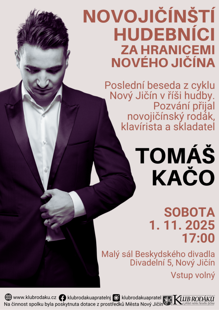 Zveme Vás v sobotu 1. 11. 2025 v 17:00 na besedu z cyklu Nový Jičín v říši hudby s novojičínským rodákem, klavíristou Tomášem Kačem.